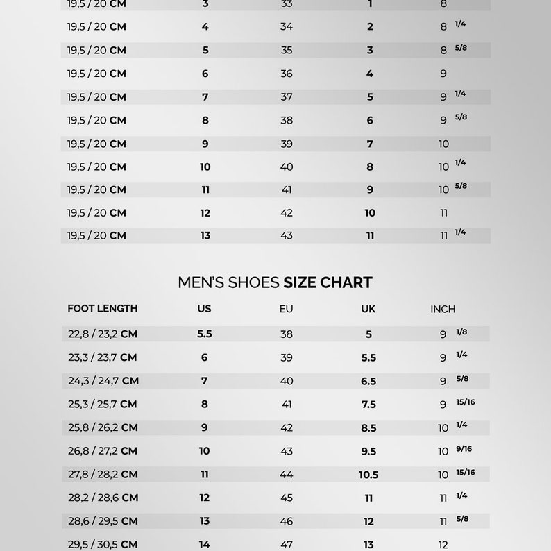As there is no standard universal shoe size, information below and size chart should help you choose your correct size; UK, EU or US.
